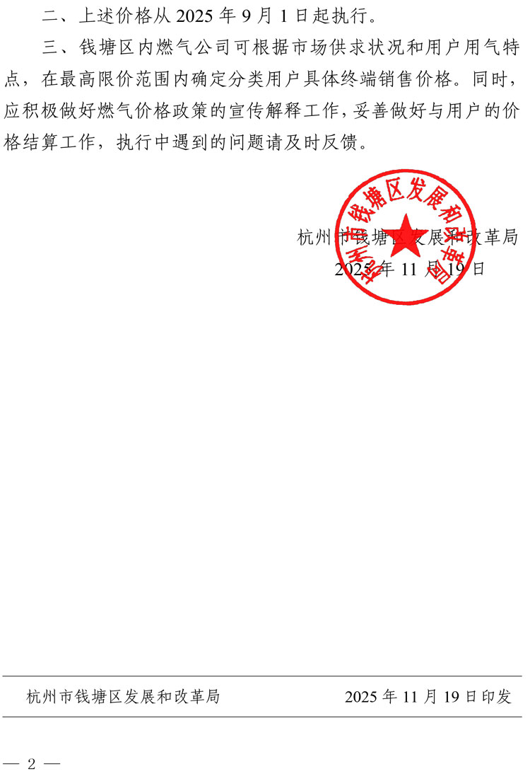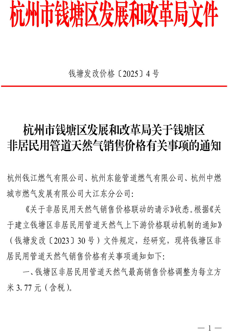 錢塘發改價格〔2025〕4號 杭州市錢塘區發展和改革局關于錢塘區非居民用管道天然氣銷售價格有關事項的通知