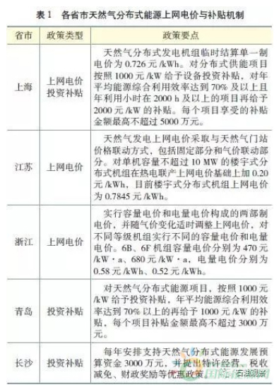部分省份出臺了天然氣分布式能源的上網電價和補貼機制。目前上海市、江蘇省、浙江省、長沙市、青島市等省市出臺了天然氣分布式能源的上網電價和補貼機制,其中上海市采用上網電價和投資補貼相結合的機制,上網電價為單一制電價;江蘇省、浙江省均采用兩部制上網電價政策;青島市、長沙市主要采用投資補貼機制。