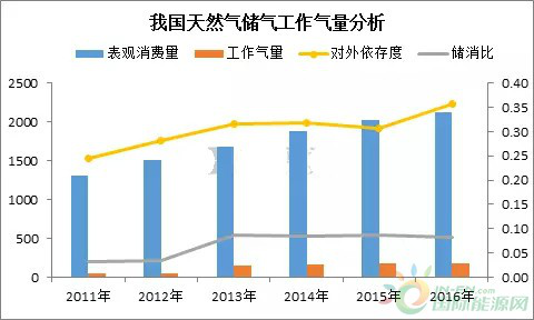 我國天然氣儲消比在8%-9%之間,低于全球平均水平11.6%。一般天然氣利用較為發達的國家,儲消比在17%-27%之間,美國天然氣儲消比為17.4%,俄羅斯為17%。據統計,當天然氣對外依存度達到和超過30%時,地下儲氣庫的工作氣量需要超過天然氣消費量的12%;如果天然氣對外依存度超過50%,則地下儲氣庫工作氣量要達到天然氣消費量的20%。我國現階段的天然氣對外依存度為36%,儲消比僅有8%左右,與12%的合理比值相去甚遠,這也可以看出我國目前在天然氣儲氣調峰方面的嚴重不足。
