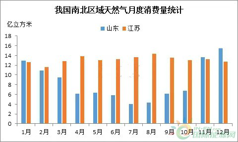 而以江蘇省為代表的南方非供暖區,天然氣月度消費量差別不大,冬季雖有居民壁掛爐,天然氣用量有所增加,但由于北方地區天然氣需求量大增,對江蘇地區天然氣供應量有所限制。而7月及8月燃氣發電用量增加;尤其是浙江、廣東等燃氣發電項目較多的南方市場,夏季為天然氣消費高峰期。