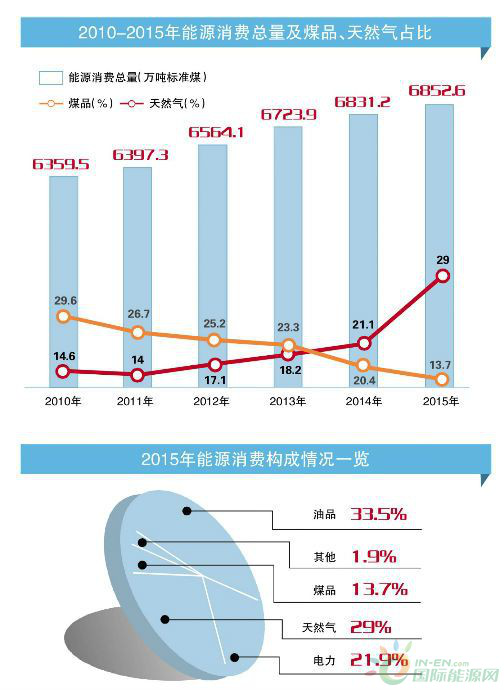 據(jù)北京統(tǒng)計(jì)年鑒公布數(shù)據(jù)顯示,在2010年-2015年間,北京的能源消費(fèi)總量從6359.5萬(wàn)噸標(biāo)準(zhǔn)煤漲至了6852.6萬(wàn)噸標(biāo)準(zhǔn)煤,其中煤品消費(fèi)的占比從29.6%下降至了13.7%,降幅達(dá)五成多,而天然氣消費(fèi)所占比重卻一路從14.6%增至了29%,增幅也達(dá)到了一半左右。
