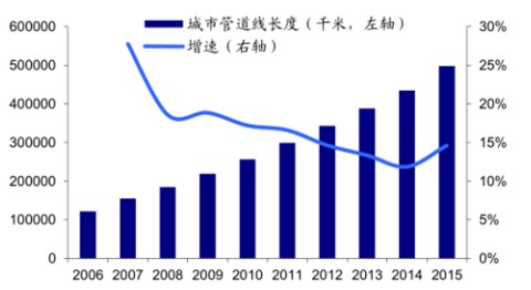 我國(guó)城市管道線長(zhǎng)度高速增長(zhǎng)