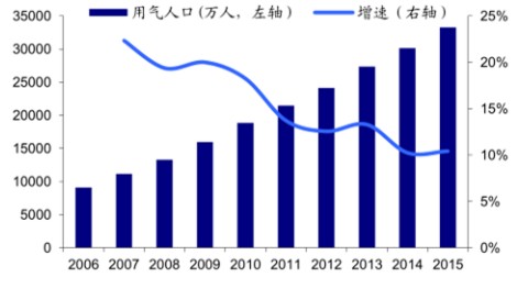 城鎮(zhèn)化穩(wěn)步推進(jìn),氣化人口顯著增加。2016 年我國(guó)城鎮(zhèn)化率達(dá)到 57%,預(yù)計(jì) 2020年達(dá)到 60%,2030 年達(dá)到 70%。隨著城鎮(zhèn)化進(jìn)程穩(wěn)步推進(jìn),城鎮(zhèn)天然氣管道和用氣人口顯著增加,過(guò)去 10 年天然氣管道長(zhǎng)度復(fù)合增速 17%,氣化人口數(shù)量復(fù)合增速 15%,城市天然氣供應(yīng)量復(fù)合增速 17.5%。未來(lái)城鎮(zhèn)增量用氣將主要來(lái)自三個(gè)方面:一是進(jìn)一步提升城鎮(zhèn)居民氣化水平,預(yù)計(jì) 2020 年達(dá)到 50%以上,2030 年達(dá)到 65%以上;二是推進(jìn)天然氣供暖,在我國(guó)南方地區(qū)有序推進(jìn)天然氣供暖工程,提高公共服務(wù)水平;三是推進(jìn)重點(diǎn)區(qū)域的氣化,尤其是京津冀和東北地區(qū),逐漸拋棄散煤供暖的方式,加快使用天然氣作為供暖原料。2017 年政府工作報(bào)告中提出,今年將全面實(shí)施散煤綜合治理,推進(jìn)北方地區(qū)冬季清潔取暖,完成以電代煤、以氣代煤 300 萬(wàn)戶以上。《天然氣發(fā)展十三五規(guī)劃》提出氣化率要從 2015 年的 43%提高到 2020 年 57%,天然氣氣化人口預(yù)計(jì)達(dá)到 4.7 億,用氣量將從 207 億立方米增加到 360 億立方米,城鎮(zhèn)燃料用氣領(lǐng)域天然氣消費(fèi)量到 2020 年復(fù)合增速 10%以上。