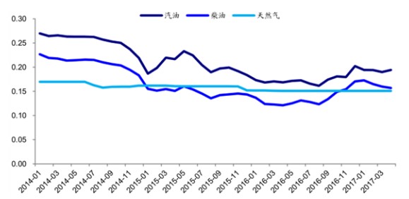 油價(jià)回升,天然氣作為燃料具備經(jīng)濟(jì)性。自 2014 年油價(jià)大跌以來(lái),汽柴油價(jià)格大幅下降,經(jīng)濟(jì)性有所提升。隨著未來(lái)油價(jià)回升,天然氣作為清潔能源經(jīng)濟(jì)性會(huì)越來(lái)越明顯,就 2017 年 4 月份而言,汽油、柴油、車用天然氣價(jià)格分別為 0.19、0.16、0.15 元/百萬(wàn)英熱單位,天然氣作為替代能源具備經(jīng)濟(jì)性。