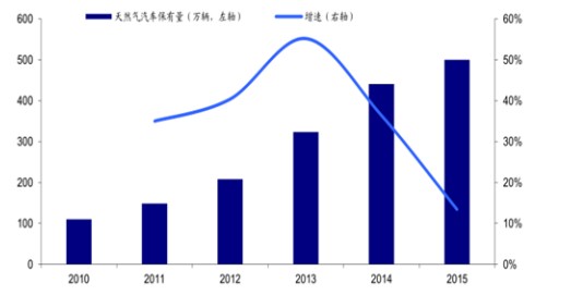 交通用氣增速放緩,天然氣汽車保有量穩(wěn)定增加。2016 年,交通運(yùn)輸行業(yè)天然氣消費(fèi)量達(dá)到 267 億立方米,占全國(guó)天然氣總消費(fèi)量的 13.3%。2015 年天然氣動(dòng)力車達(dá)到 500 萬(wàn)輛,同比增長(zhǎng) 13.4%。由于經(jīng)濟(jì)放緩、油價(jià)下跌,天然氣相對(duì)成品油經(jīng)濟(jì)優(yōu)勢(shì)不明顯,增速有所放緩。在政策推動(dòng),經(jīng)濟(jì)回暖,油價(jià)上漲下,天然氣汽車保有量有望進(jìn)一步增長(zhǎng),預(yù)計(jì)到 2020 年天然氣汽車用氣量達(dá)到 363 億立方米,年復(fù)合增速 6%。