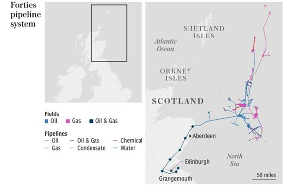 Forties負責管理管道的的運營商Ineos已經警告說,它可能會關閉幾個星期,因為它修復了上岸地點南部的阿伯丁郡的一個斷裂的斷面,有多達85個接到管道的油田被關閉,直到斷裂面被修復。Ineos已經成為北海十大生產商之一,此前,該公司斥資10多億美元收購丹麥可再生能源集團Ørsted的石油和天然氣業務。