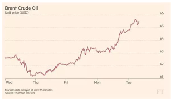 國際原油基準布倫特原油周二早盤上漲,達到每桶65.70美元的高點,上漲1.6%,然后回落至65.33美元,上漲0.9%,創下自上個交易日以來的最高點。
