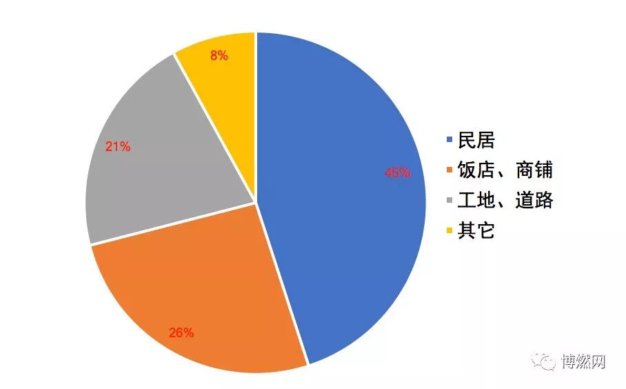 2018年4月,發(fā)生在民居中的燃氣事故共19起,占比為45%;因施工挖斷燃氣管網(wǎng)的事故共9起,占比為21%;發(fā)生在飯店、商鋪的燃氣故事共11起,占比為26%;發(fā)生在其它事故地點的事故共3起,占比為8%。