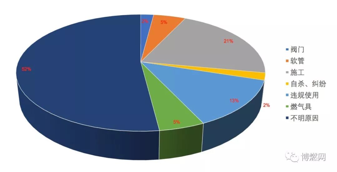 據(jù)博燃網(wǎng)不完全統(tǒng)計,2018年4月我國共發(fā)生燃氣事故42起,共造成5人死亡,55人受傷。其中,發(fā)生在居民家中的燃氣事故共19起,占比為45%;因施工挖斷燃氣管網(wǎng)的事故共9起,占比為21%。