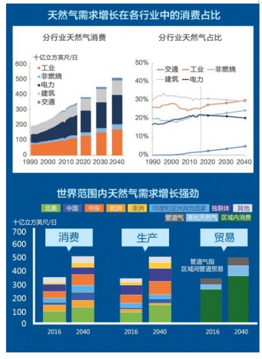 此前,??松梨诤?/span>BP兩大石油巨頭先后發布了2040年的能源展望,對天然氣需求快速增長持樂觀態度。??松梨谡雇J為,到2040年全球天然氣需求將比2016年增加近40%。BP則將能源需求三分天下,世界正走向多元化的能源發展趨勢,其中石油、天然氣和煤炭各占1/4,另1/4來自可再生能源和核能。世界主要石油公司高管們紛紛表示,油氣仍是公司發展重點,天然氣將是重中之重。天然氣業務未來將成為這些公司的投資重點和主要方向,市場機遇和需求量是空前的。