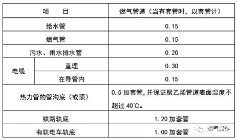 9.室內燃氣管道與墻面的凈距:當管徑小于25毫米,不少于30毫米,管徑在25-50毫米時,不小于50毫米,管徑大于50時,不小于70毫米。立管安裝時,距墻角的垂直投影距離不小于300毫米,距水池不小于200毫米。燃氣管道與電纜引入管的進線箱水平距離不小于30厘米;與明裝或暗裝電線的水平間距均不小于10厘米;與明裝或墻內的閘箱、表盤、接線盒的水平間距不小于10厘米。與明裝或有暗裝電線交叉凈距不小于3厘米;禁止在裝有電纜的總溝道內敷設燃氣管道。
