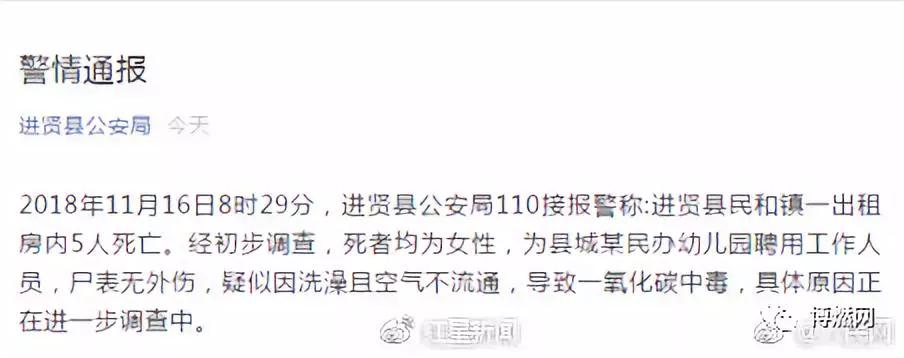 新聞事件:2018年11月16日,中國江西網(wǎng)報(bào)道,有網(wǎng)友向中國江西網(wǎng)爆料稱,南昌市進(jìn)賢縣豐和名城幼兒園發(fā)生一起煤氣泄漏事件。隨后,2018年11月16日8時(shí)29分,進(jìn)賢縣公安局110接報(bào)警稱:進(jìn)賢縣民和鎮(zhèn)一出租房內(nèi)5人死亡。經(jīng)初步調(diào)查,死者均為女性,為縣城某民辦幼兒園聘用工作人員,尸表無外傷,疑似因洗澡且空氣不流通,導(dǎo)致一氧化碳中毒,具體原因正在進(jìn)一步調(diào)查中。