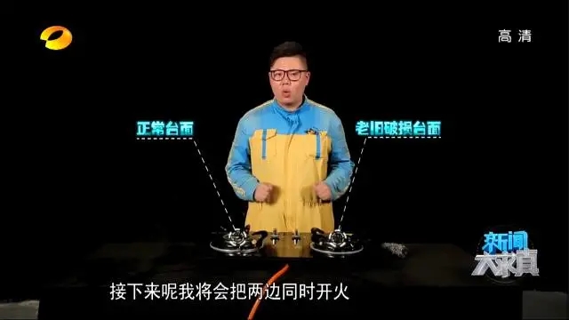 這一次液化氣使用的是正常的液化氣灶臺(tái)為了模擬極端情況,實(shí)驗(yàn)人員將其中一個(gè)灶圈涂滿油污,并讓灶圈的位置有些偏離。