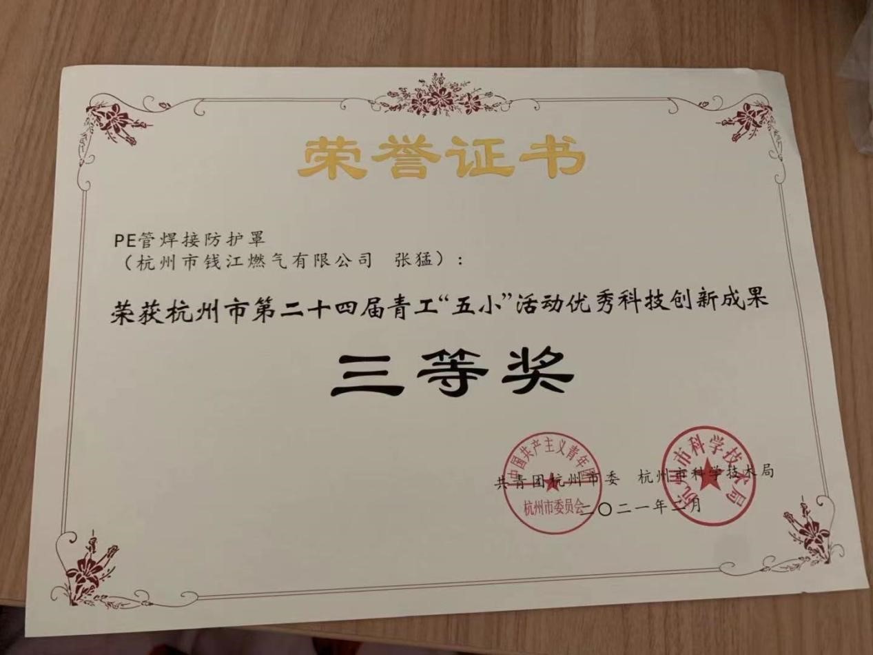 喜訊!錢江公司張猛“PE管焊接防護罩”榮獲杭州市第二十四屆青工“五小”活動優秀科技創新成果三等獎