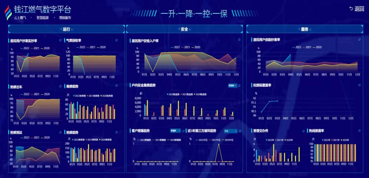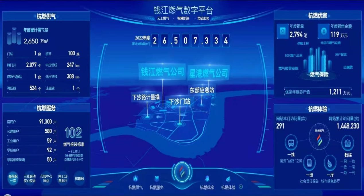 錢江數字平臺貼合“杭燃供氣、杭燃服務、杭燃優家、杭燃體驗”四大產品布局,結合公司特色,在年度指標、氣量結構、巡搶修情況、用戶管理、優家產品銷售、體驗景點線路等方面,將一切業務數字化、一切數據業務化,利用數字賦能生產運營及客戶服務,縱深推進科學化、精細化、智能化的管理手段,實現了公司向信息化建設轉型發展的關鍵一步。