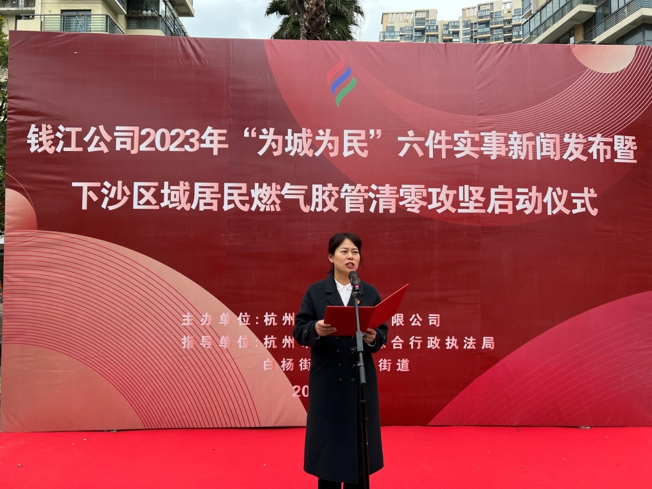 發布會首先由錢江公司總經理何香作新聞發布,對2022年錢江公司圍繞城市安全、惠城惠民開展六件實事的豐碩成果進行了介紹,并圍繞老百姓關心的“熱點、難點、盲點”,聚焦用氣過程中的“所急、所需、所盼”,對2023年“為城為民”六件實事作發布:一是迎亞運、除隱患、保安全,提升燃氣服務;二是“溫度管家”數字賦能,暢通渠道優化服務;三是清除用氣“空白點”,實現綠色能源全覆蓋;四是打造“智慧燃氣”平臺,推廣智能預警系統,提升供氣安全保障;五是推出“管道彩繪”DIY定制化服務,為杭城亞運“增色添彩”;六是三十周年一路同行,惠民回饋共促發展。隨后白楊街道調研員周勝利發布《倡議書》,全力護航亞運,沖刺攻堅下沙區域居民燃氣管“清零”行動。