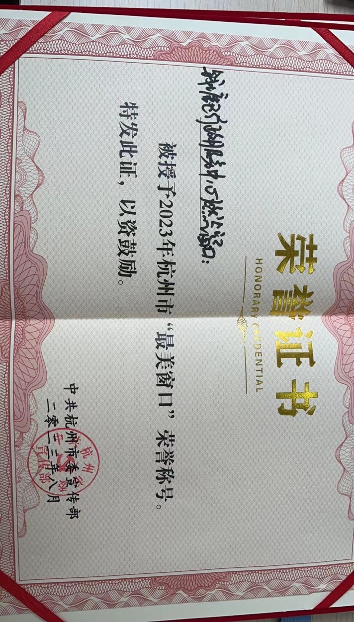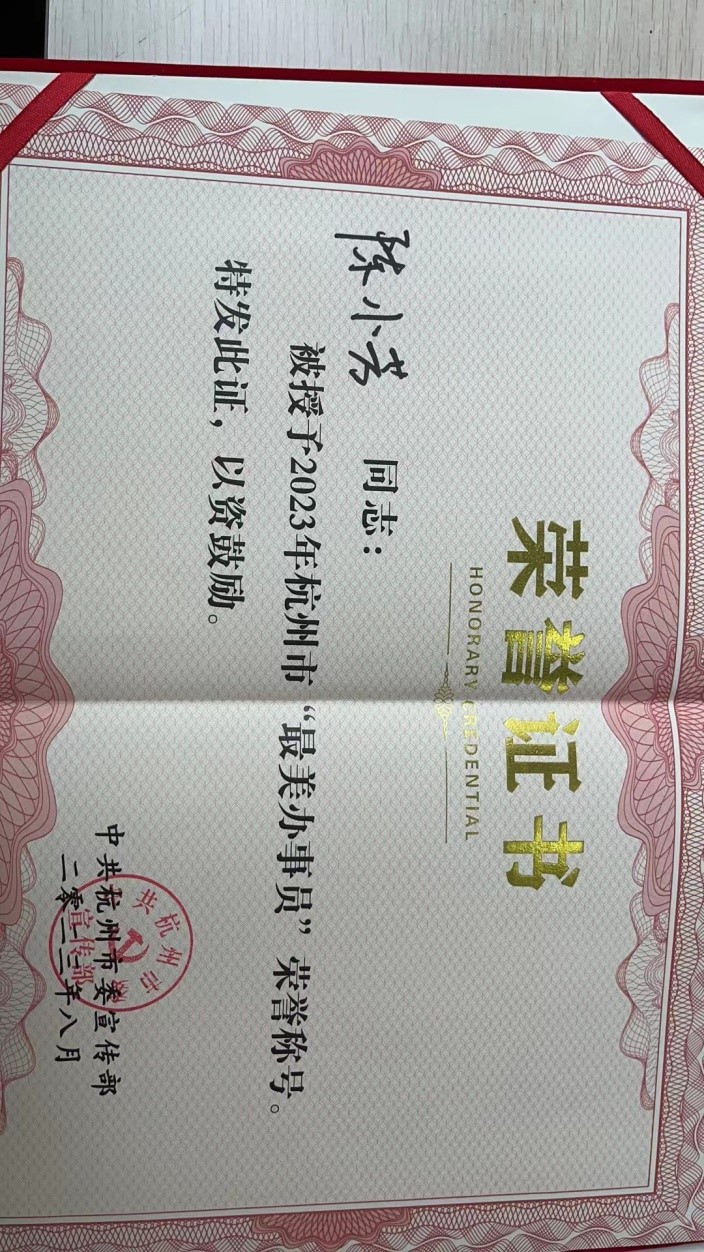 2023年8月,經積極爭創、層層選拔,錢塘區政務服務中心燃氣窗口被中共杭州市委宣傳部授予2023年度杭州市“最美窗口”榮譽稱號,陳小芳被評為2023年杭州市“最美辦事員”。