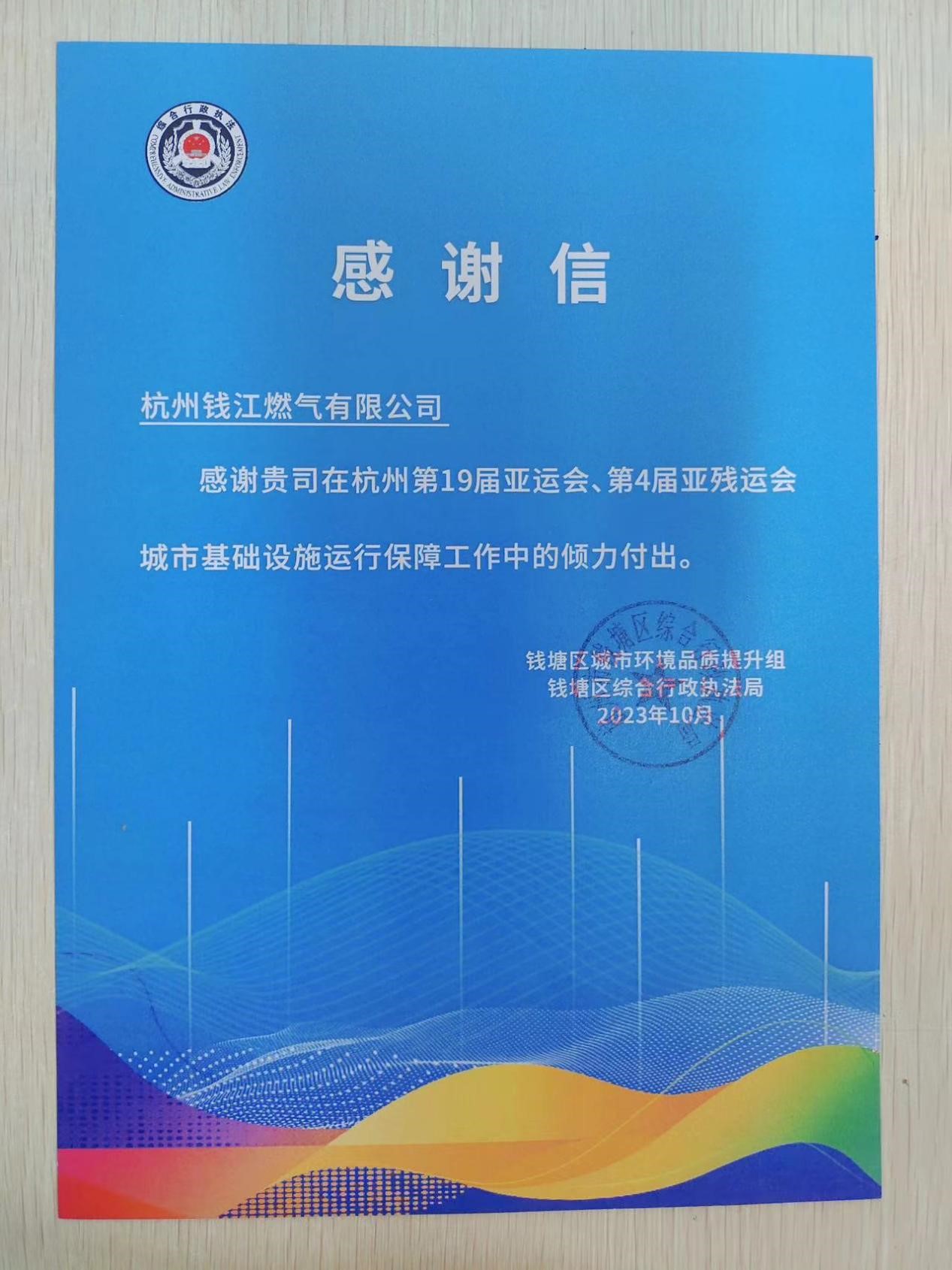 11月2日,錢塘區城市環境品質提升組聯合錢塘區綜合行政執法局專程派人將一封感謝信送至錢江公司,對我司在亞運、亞殘運會期間于城市燃氣保障服務工作中的無私付出予以誠摯感謝。