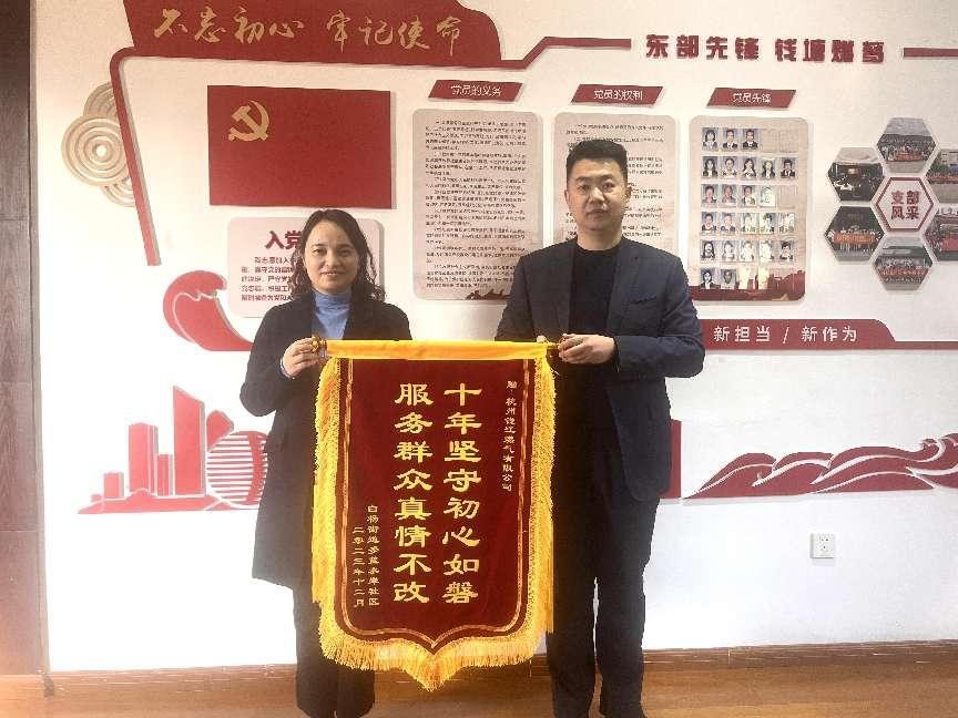 簡單事情重復做,重復事情堅持做,堅持事情用心做,2023年12月5日下午,白楊街道多藍水岸社區陳書記為錢江公司送來錦旗,感謝錢塘區政務服務中心燃氣窗口工作人員十年如一日在多藍水岸社區開展敬老便民服務工作,真心真情為社區老人提供便利。