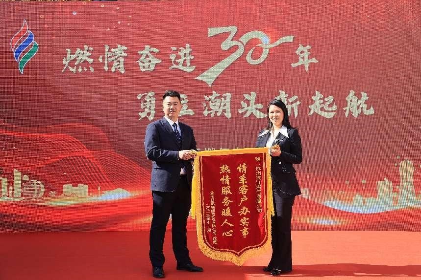 11月29日,錢江燃氣召開公司成立30周年慶祝活動,在活動現場,金卡智能集團股份有限公司負責人將一面“情系客戶辦實事,熱情服務暖人心”的錦旗送予杭州錢江燃氣有限公司,以表示對錢江燃氣心系用戶、優質服務的誠摯感謝。