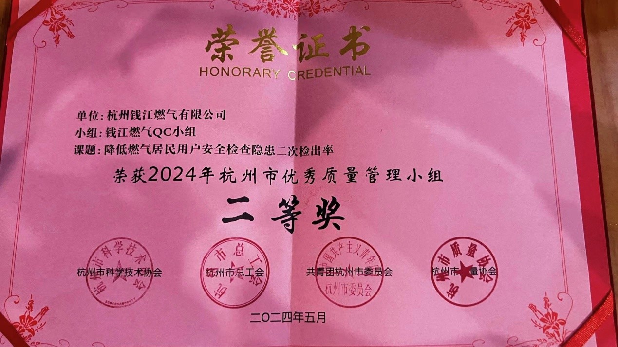 5月24日,由杭州市科學技術協會、杭州市總工會、共青團杭州市委員會和杭州市質量協會聯合主辦的2024年杭州市優秀質量管理小組成果發布會圓滿落幕。杭州錢江燃氣有限公司憑借QC成果《降低燃氣居民用戶安全檢查隱患二次檢出率》,在全市近400個參賽項目中脫穎而出,榮獲二等獎。